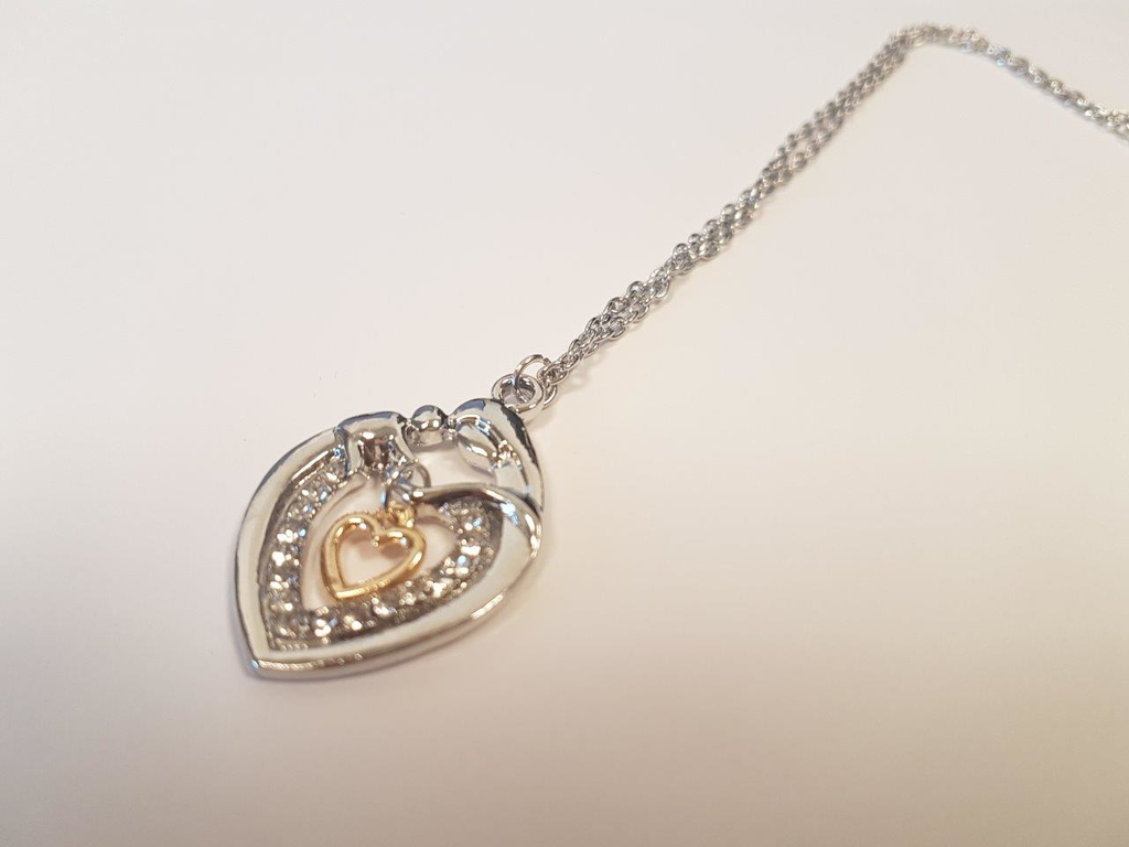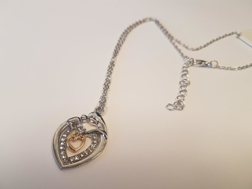 Vackert och detaljrikt silver och guldfärgat halsband med hjärtan och strass! Passar såväl fest som vardag!